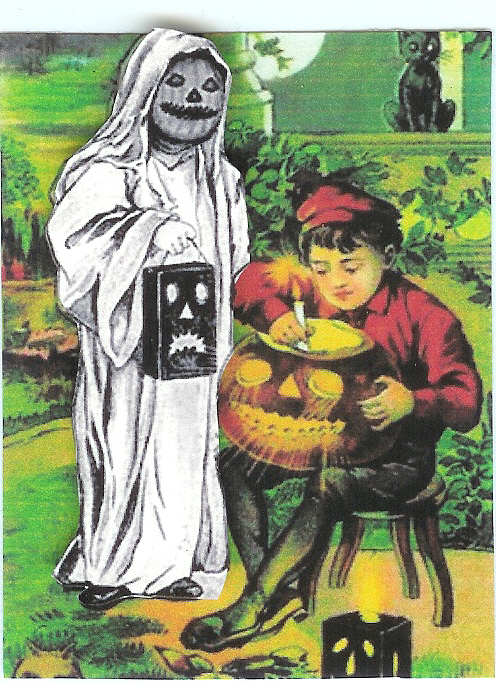 This particular ATC was made by printing the original in its original color format. I then altered the original to black and white. I printed these and cut out the ghostly figure. I then used adhesive dots that add height of about an eighth inch to adhere the ghost to the ATC.