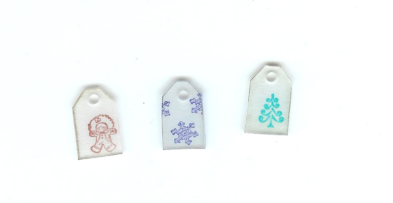 The gingerbread man is from some Stampin’ Up! set whose name I no longer have. It is stamped in Brilliance ink in Cosmic Copper. The edges of the charm are edged with a Sharpie in metallic copper.