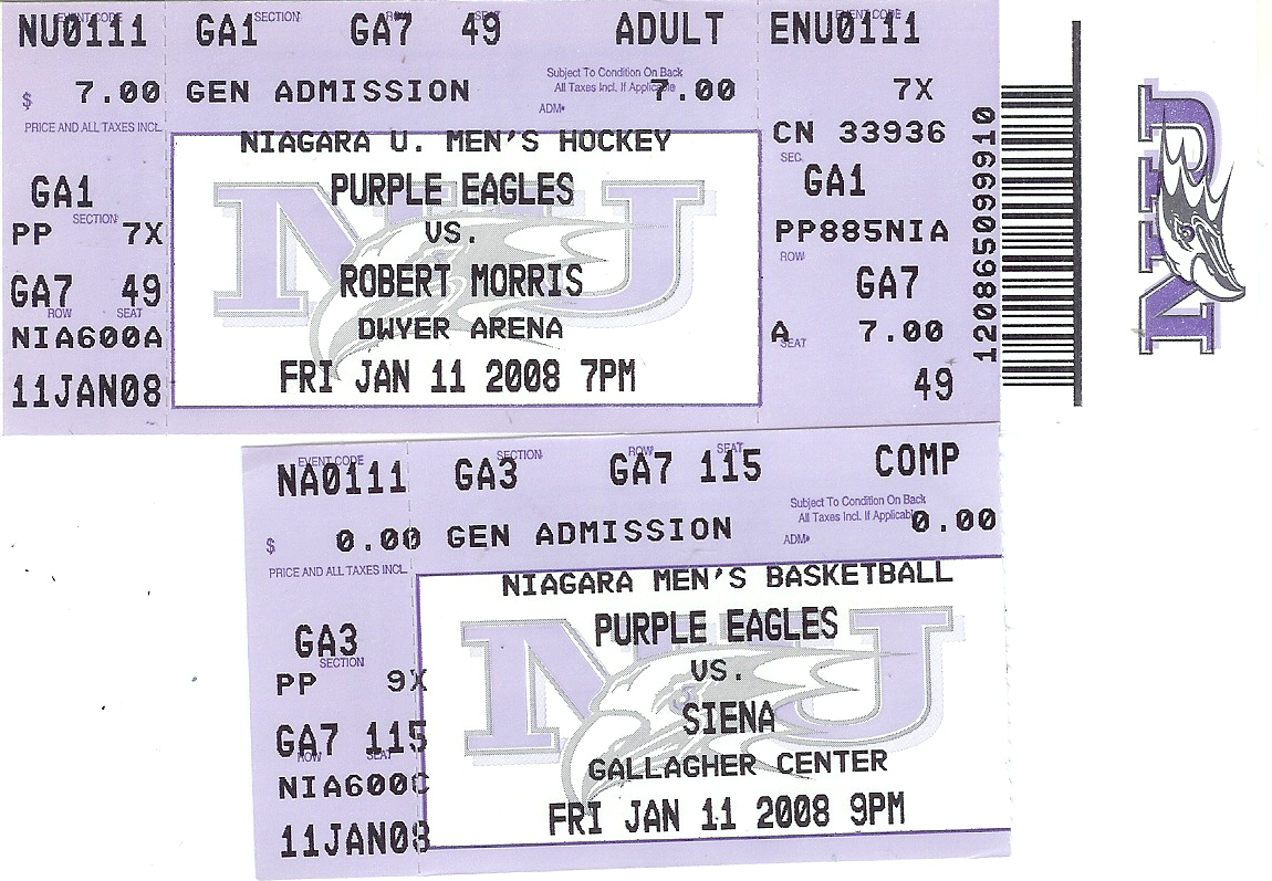 A very windy walk over to Dwyer Arena put us at our first athletic event – the Purple Eagles of Niagara against the Colonials of Robert Morris in men’s ice hockey. Having watched two Purple Eagles’ games last weekend, I have to say that last night’s was probably the best of the three. I don’t say this because the end result was a 7-2 win but because it was by far the most physical and well-skated of the three games.