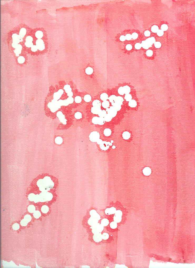 After I painted the entire page with this color combination, I let everything dry. After drying, I took clean newsprint and ironed the wax off the paper. I had tried to direct the wax so as to make shapes but the finished product does not look as if I did.