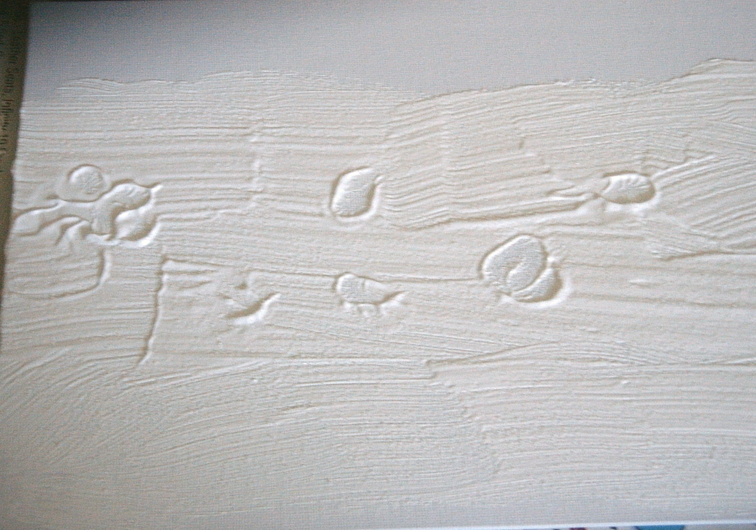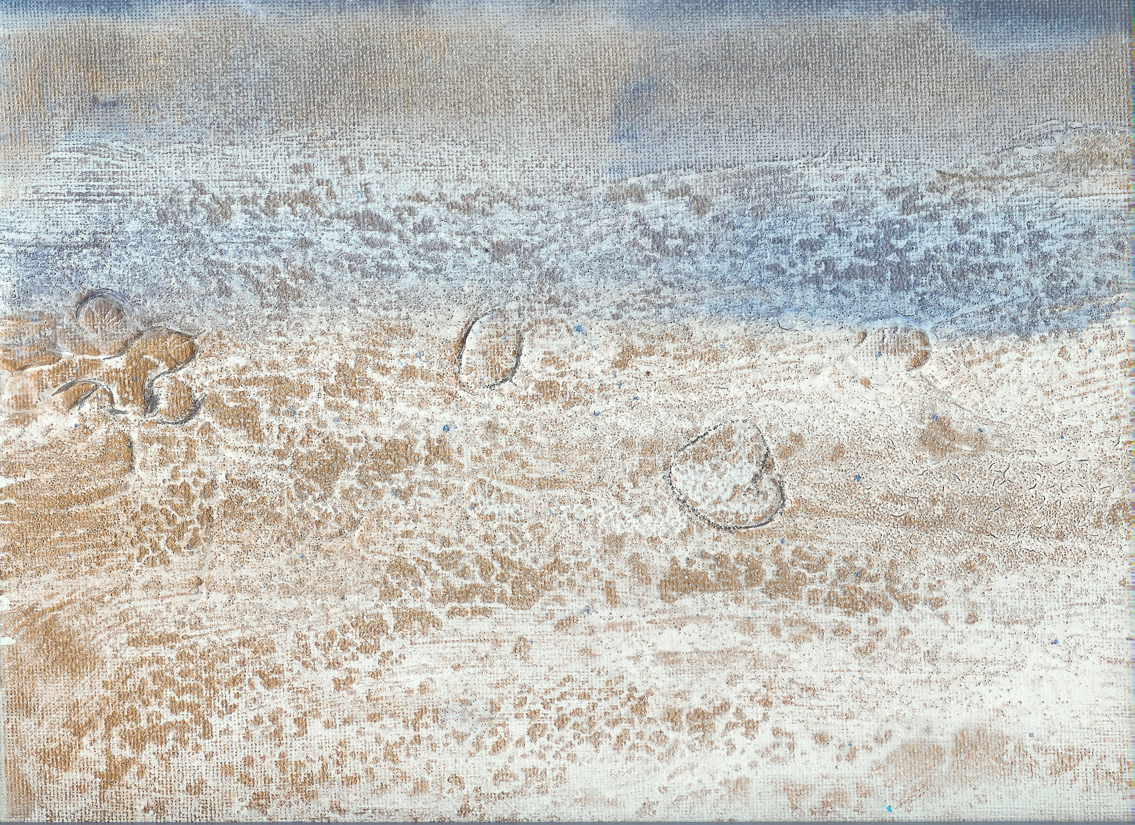 Well, the initial work – gesso and making some imprints and salting – are dry and I have worked on the watercolor part of my seascape. I had a Pearl Ex-Press palette from some years ago so I decided I was going to use those as my watercolors this time. Below is the result. This is still not the finished product.