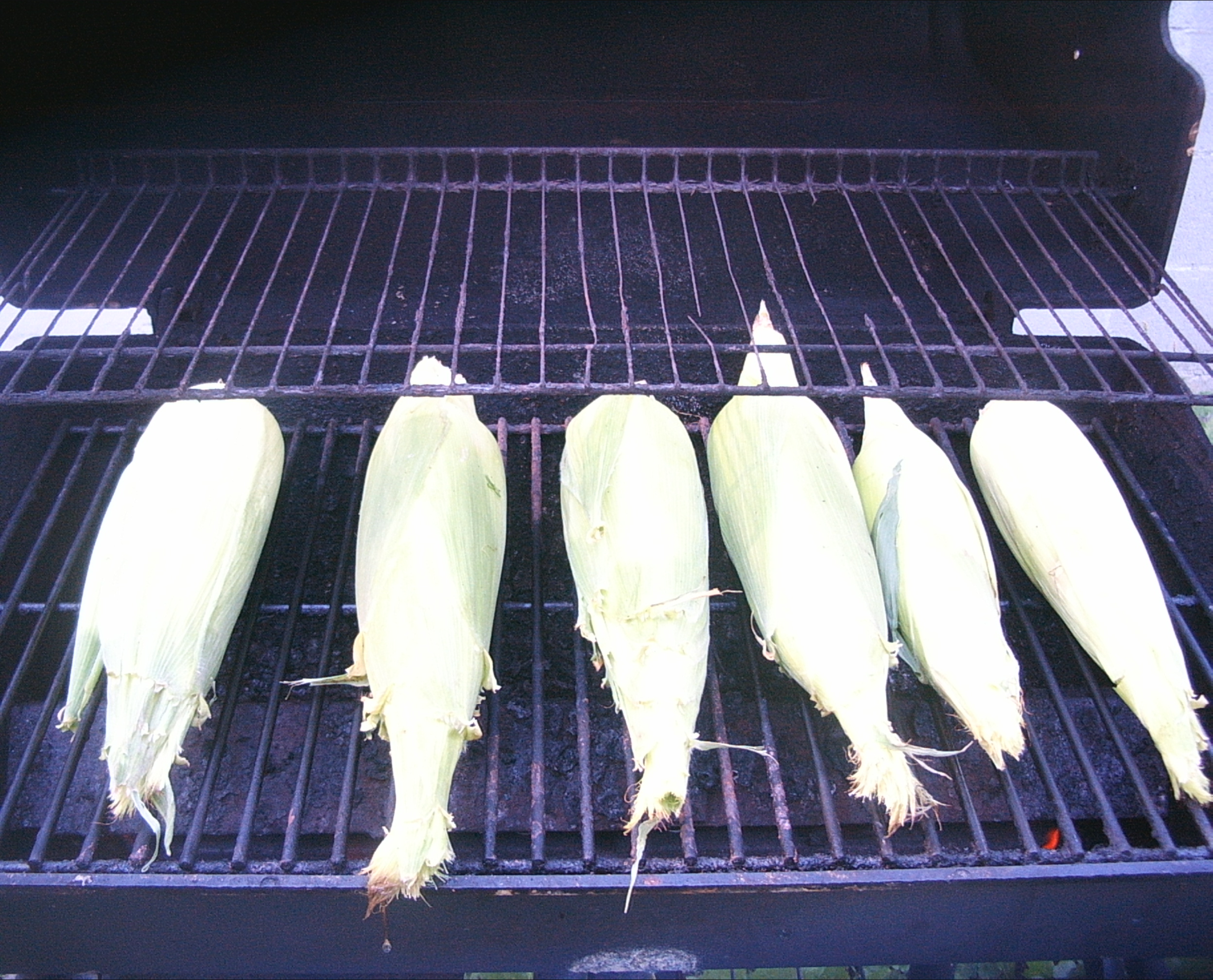The corn soaks in the sink for about an hour or an hour and a half. This is to prevent the corn from burning on the grill. All big tassles and silk that is sticking out is removed. Loose pieces of the stalk are also removed. Then, the corn is put on the grill. It is turned a quarter turn every five minutes and takes about 45 minutes to cook. Yes, this is longer than sticking the husked ears of corn in a pot of water on the stove but the taste is amazing. Also, I could do this first as I wrapped the corn in a towel when I took it off the grill and it stayed hot.