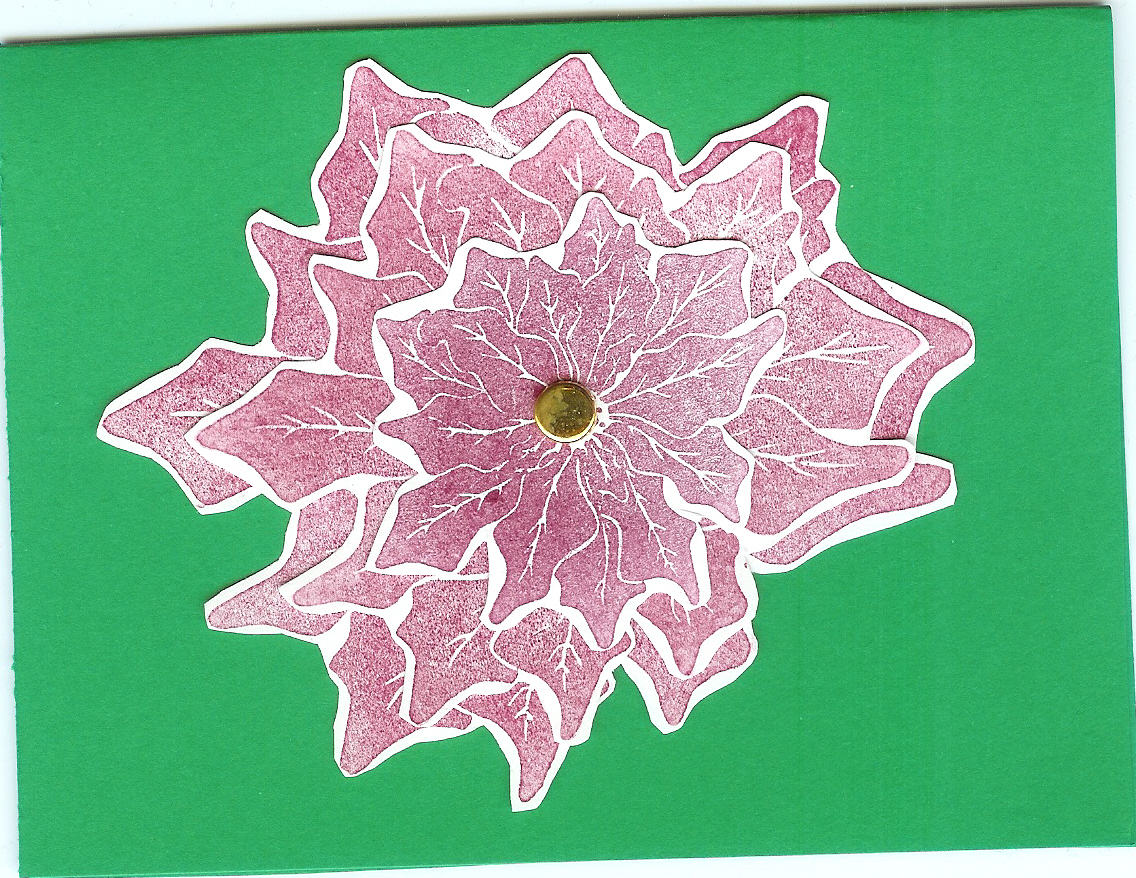 The poinsettia is actually three separate stamps in different sizes.  I used Adirondack ink in cranberry and stippled it on the stamp.  That seemed to be the only way I could get any of the three sizes inked up properly.  I did the stamping last night.  I did the cutting out of one set of three poinsettias the morning and then set the card with a brad to hold them together.  I need to find a front sentiment but will possibly leave it just the flower.