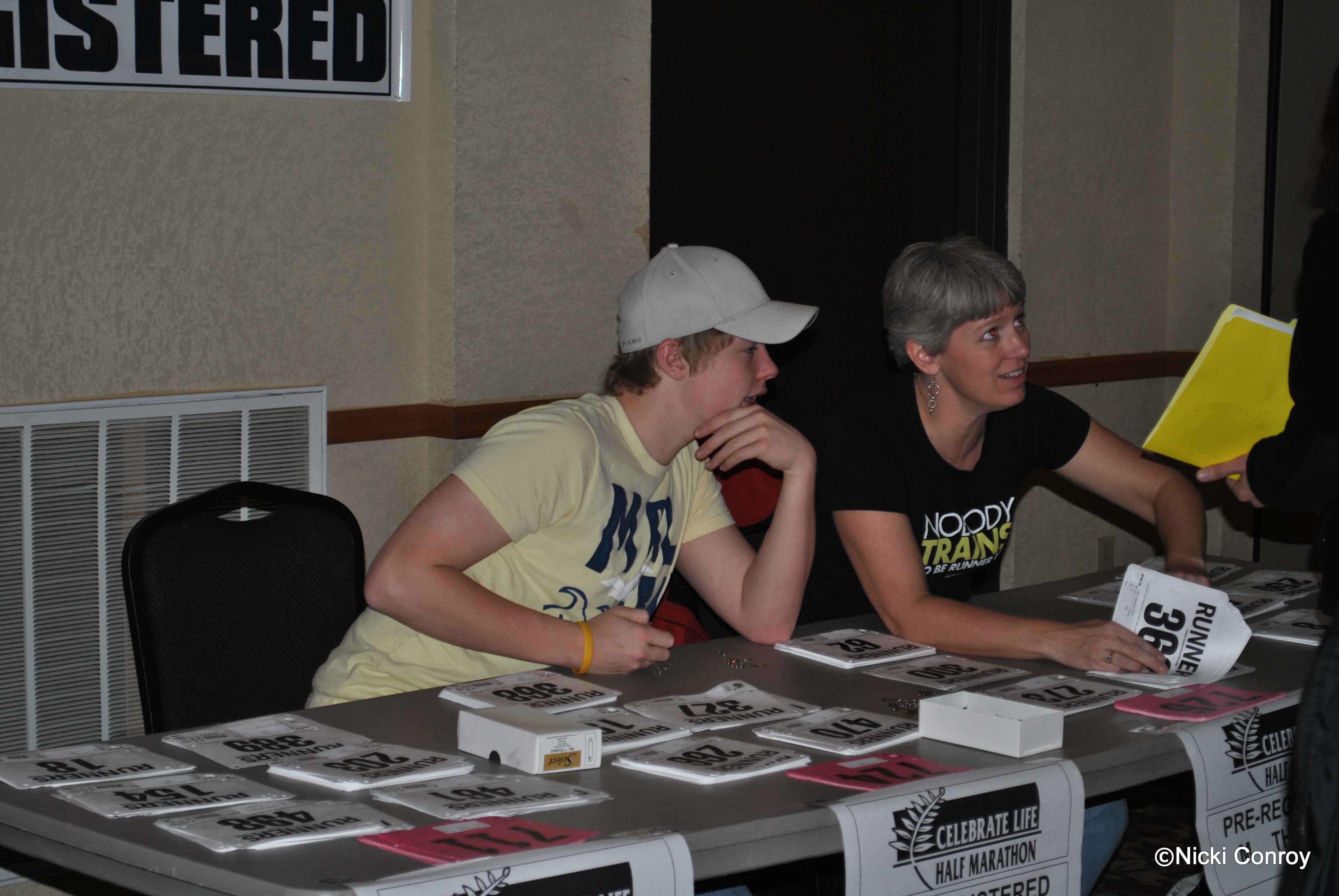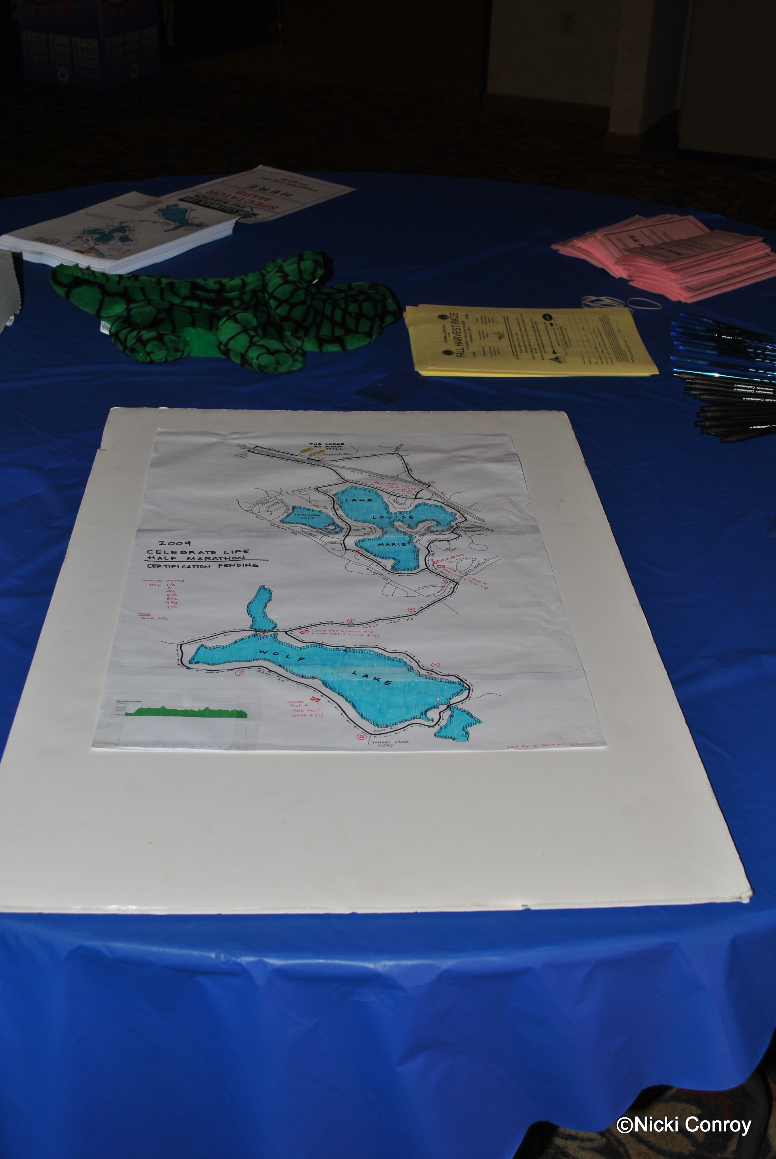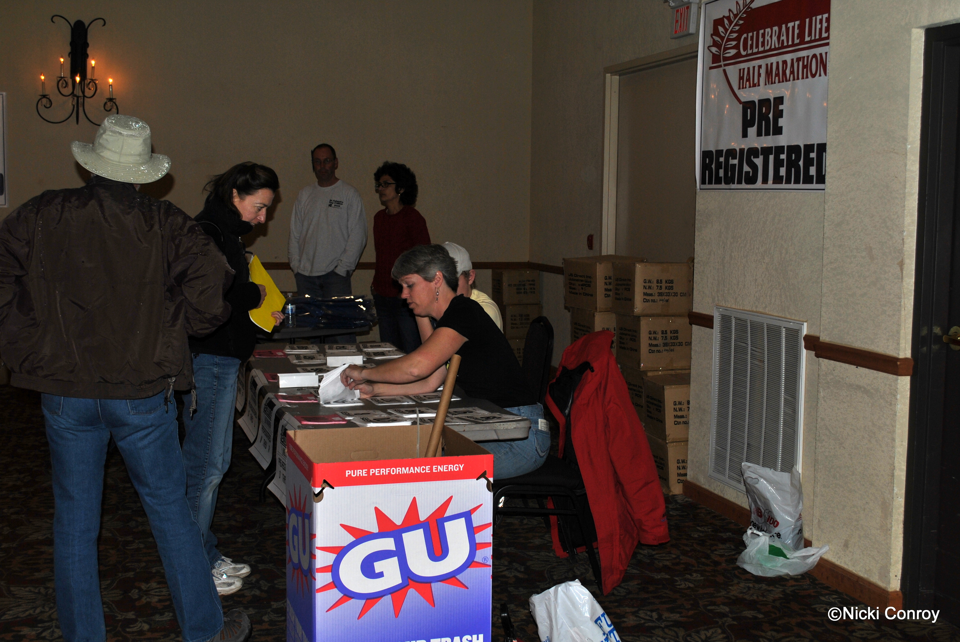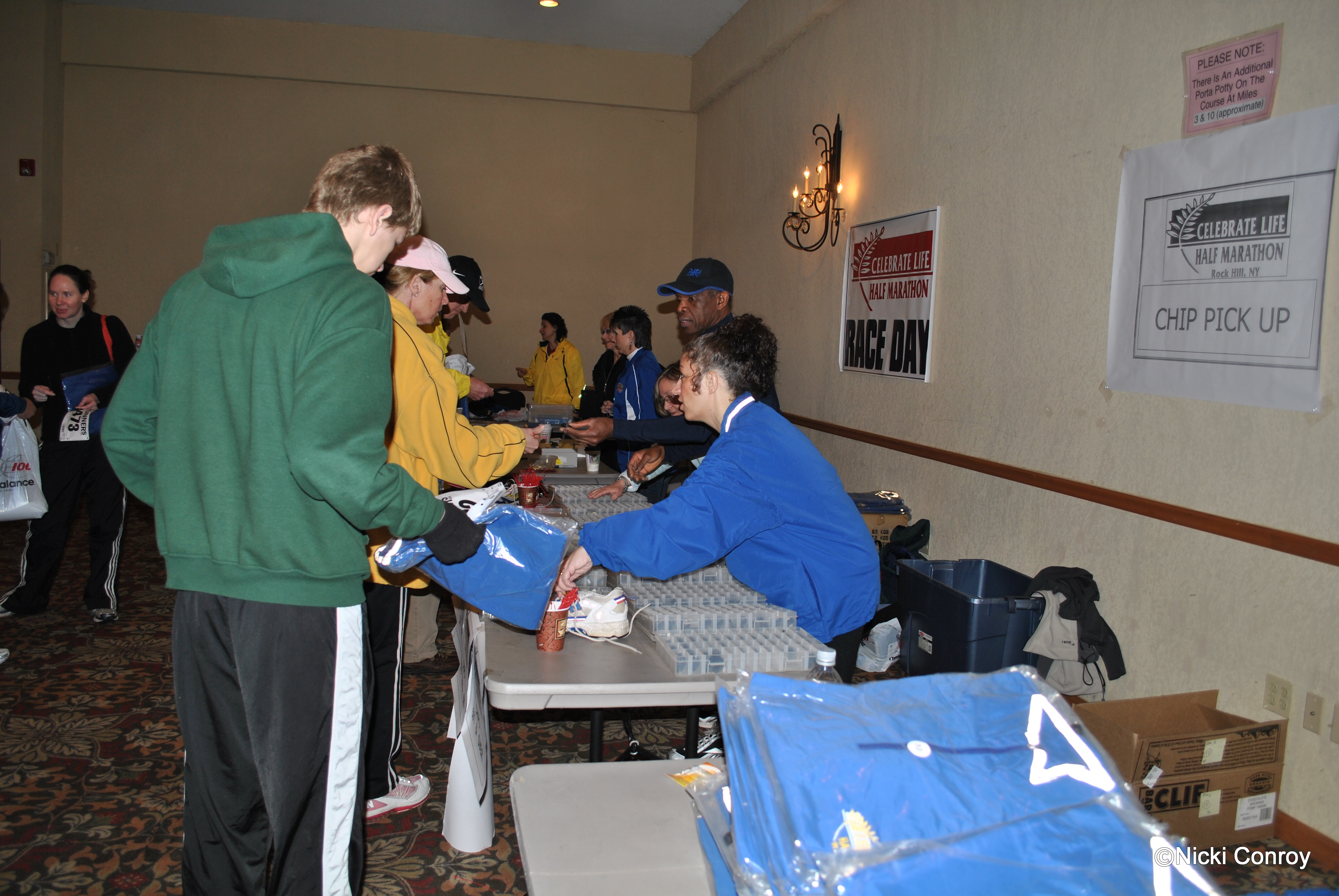 These pictures were all taken on Saturday evening before we all went to dinner.  About 30 people picked up numbers, goodie bags and windbreakers (more on this later) Saturday.  555 people pre-registered to either run or walk the course.
