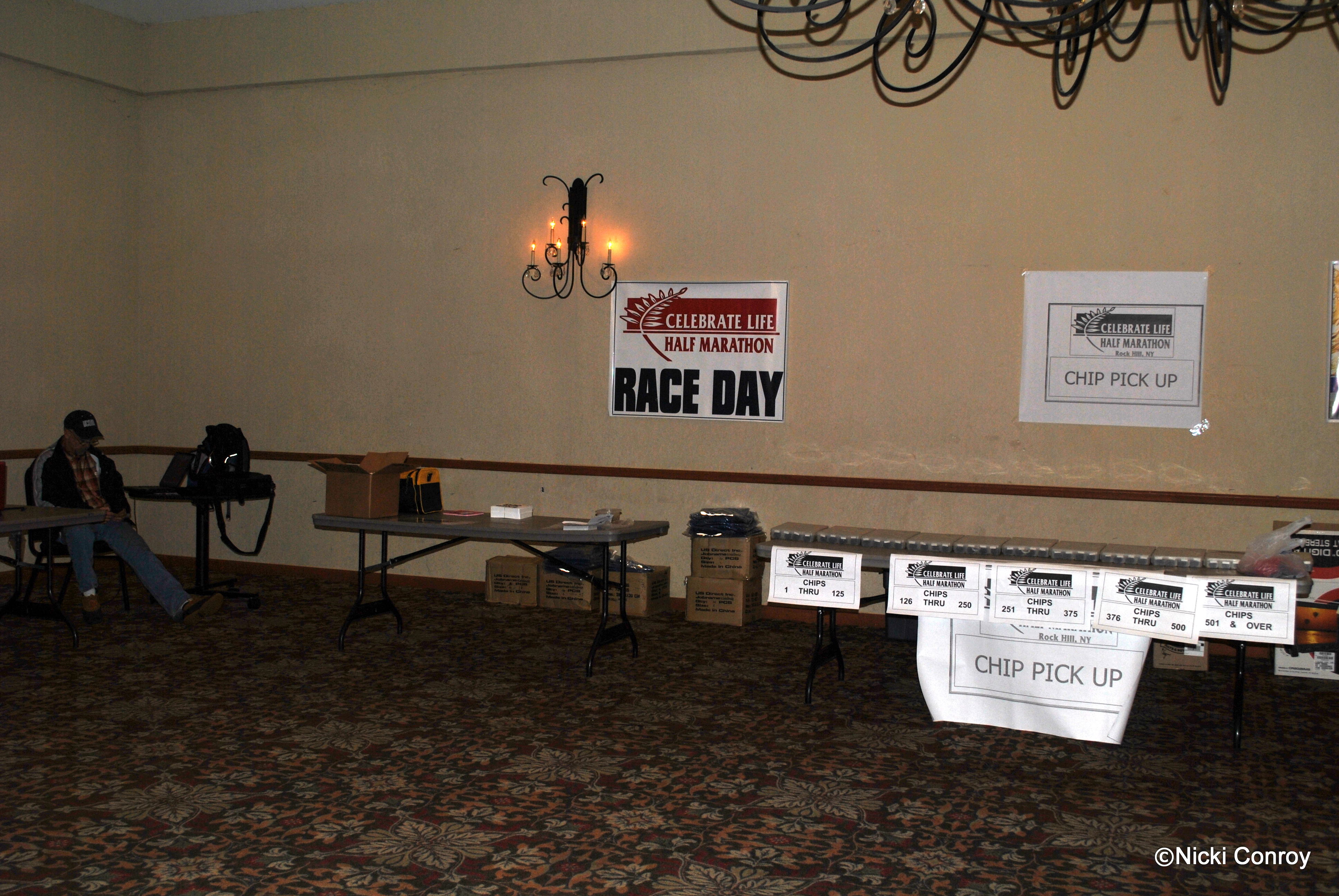 I got to The Lodge at Rock Hill about 4 pm.  Packet pick-up was scheduled to be from 4-6 pm.  I checked in and unloaded my junk.  Weather was going to be iffy on Sunday so I had a suitcase full of running gear.  I was unsure what I would need.  I then went down to the ballroom/conference room to pick up my packet and help.  Yes, Kristy – who is a teacher in my area and has kids in Scouts with my youngest – Kristy’s sister is one of the race directors.  I had told Kristy I would help if I got there early enough.  I helped people pick up their packets and took pictures.