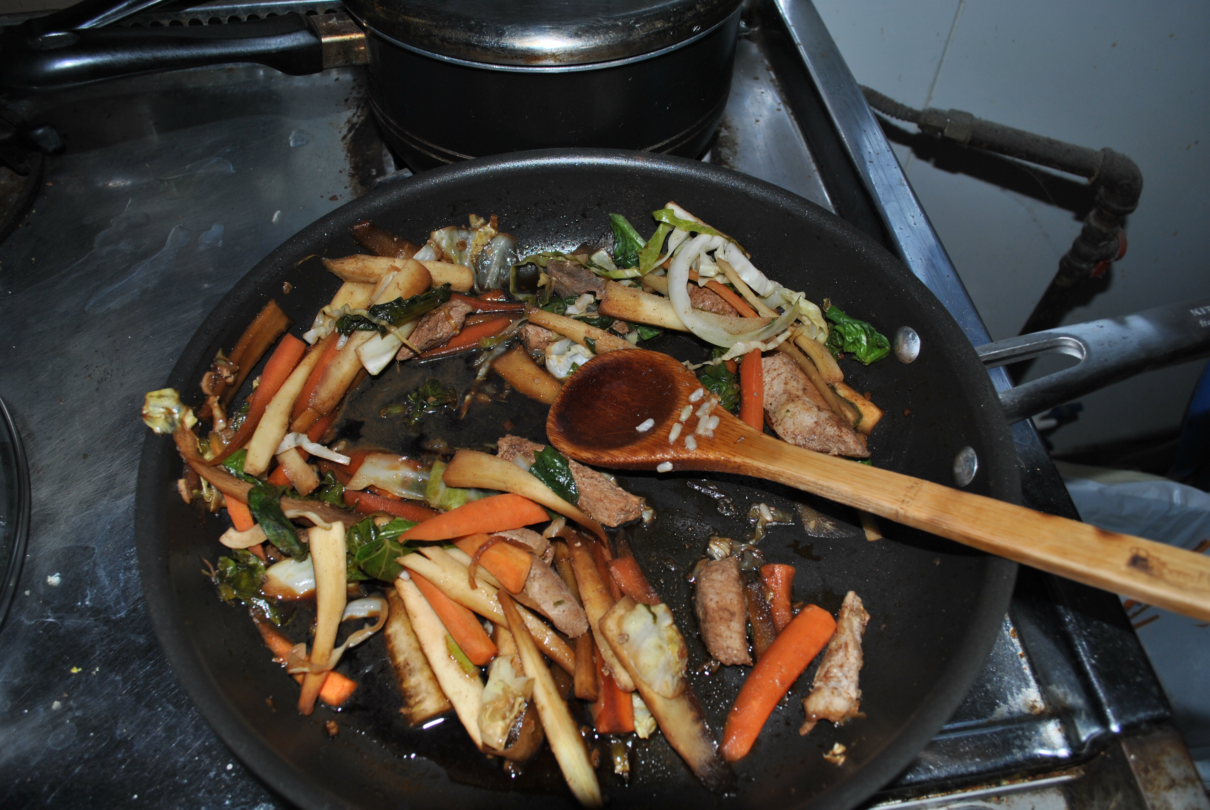 So the other day – actually it was a week ago – I had some pork chops that had been in the freezer since a sale in the fall. No one wanted pork chops and however I was fixing them back then so I had frozen the remainder of the chops uncooked. I took these out to thaw and then went through the fridge. I had parsnips – bought for beef and beer stew a few weeks back, carrots – always on hand, cabbage – leftover from St Patrick’s Day and not yet cooked, celery – always on hand, spinach – always on hand. I decided then and there it was pork stir fry