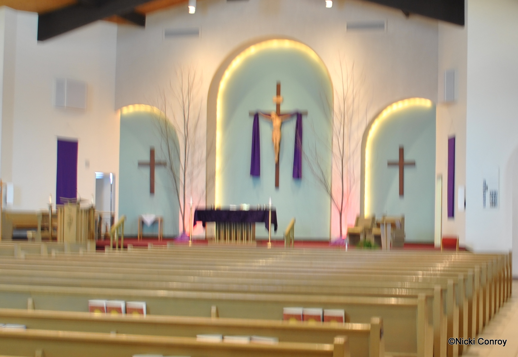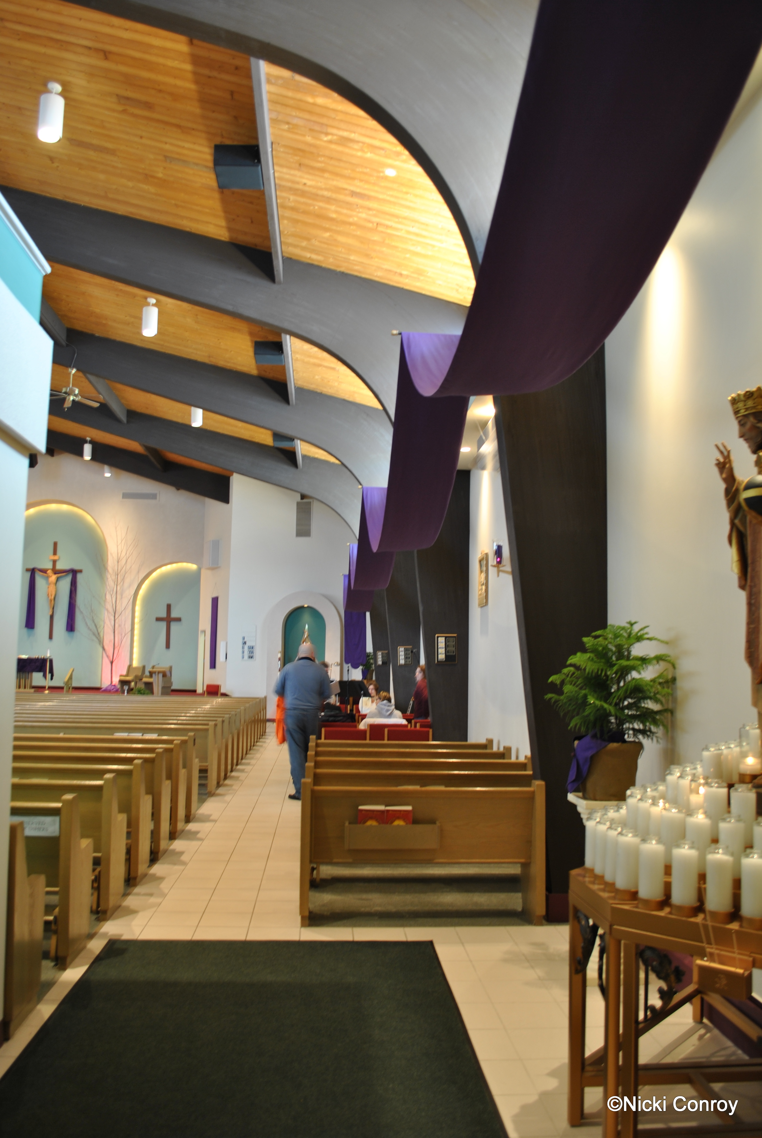 Today, if nothing else, people who walked into the church would have noticed the red. People would also notice the fresh palms. Palms are given out one day a year – Palm Sunday – in the Catholic Church. Old palms are burned to create the ashes used for Ash Wednesday, a complete circle.