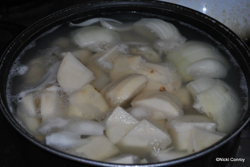 Place potatoes in a large pot of lightly salted water. Place quarter onion in water also. Bring to a boil, and cook until tender, about 15 minutes.