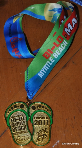 The last 6 miles are seriously just a blur in my mind. I recall the trail area but that is it until I saw Broadway at the Beach. I knew I was close by then and was not going to take a break but was going to move. When I hit the end of the race, I wondered how many different people could fit in a chute if there were a lot of people finishing at once. As I came to the turn, I saw Rob’s wife waiting for him. I waved. I handed my water bottle off to Ben as I saw him. He had everything with him I wanted him to bring, except I had forgotten to remind him to bring a camera. I allowed a young man to put the finisher’s medal over my head. Wow! was all I could think. That medal is heavy.