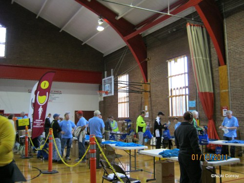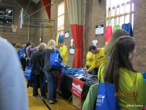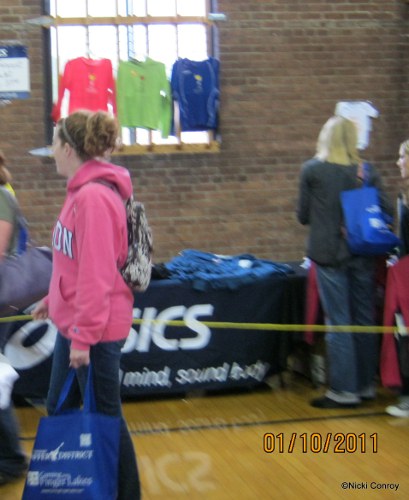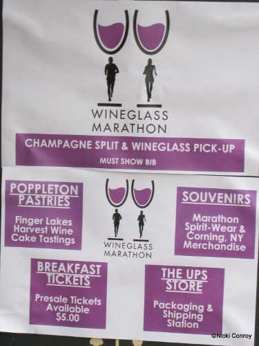 Steve and I headed to the expo about 1:30 Saturday afternoon. I have been to Wineglass twice as a spectator so knew what previous expos were like. I realized that they have just one sponsor at the expo and that it is a small race, even though the numbers have increased drastically in the last two years. Upon entering the YMCA in Corning – a new and indoor location as opposed to a tent outside – a volunteer instructed us to check the wall for our bib number. I knew mine so proceeded on to the next line while Steve looked his up.