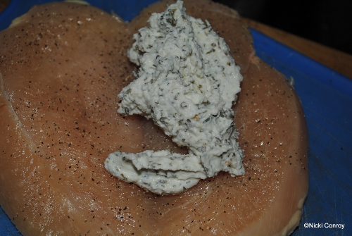 Take a half cup of ricotta cheese (for four chicken breasts). Mix thyme, basil and parsley in with the ricotta. Add some grated parmesan cheese. I do this to taste as I like to taste the herbs more than additional cheese. Place a quarter of this inside each seasoned chicken breast as shown and close.