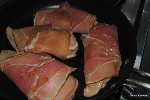 Wrap each chicken breast with two thin slices – not shaved – of prosciutto. Place in a pan on the stovetop with a tiny bit of olive oil in the pan and brown the pieces on both sides. Place in an oven for 20 minutes.