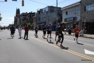 Being in the last corral – or even in the corral in front of me, we all were around the corner from the start line. We couldn’t hear the gun but knew the start was near when the volunteers started moving the corral gates. A loud round of applause went up when the corral gates were moved. Approximately 20 minutes later, we all crossed the start line. This is a new record for me. I have never taken that long to reach a start line. My previous longest was at the 2010 Boilermaker 15K when it took me 8 minutes to cross the start line. I feared the crowded field would make it impossible to see potholes or manhole covers. I didn’t want to twist something right at the start.
