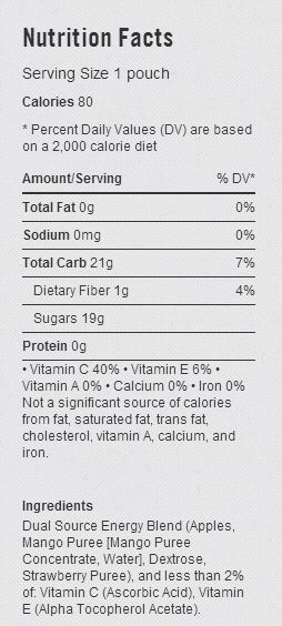 The PowerBar Blends have a 2:1 glucose to fructose blend which is suppose to help with energy. I do believe it did that. The bigger issue may be that it did not provide a lot of calories. I’m not upset about the fact that one pouch has only 80 calories. And I have put the nutrition information from PowerBar below. There is not much in this blend other than fruit.