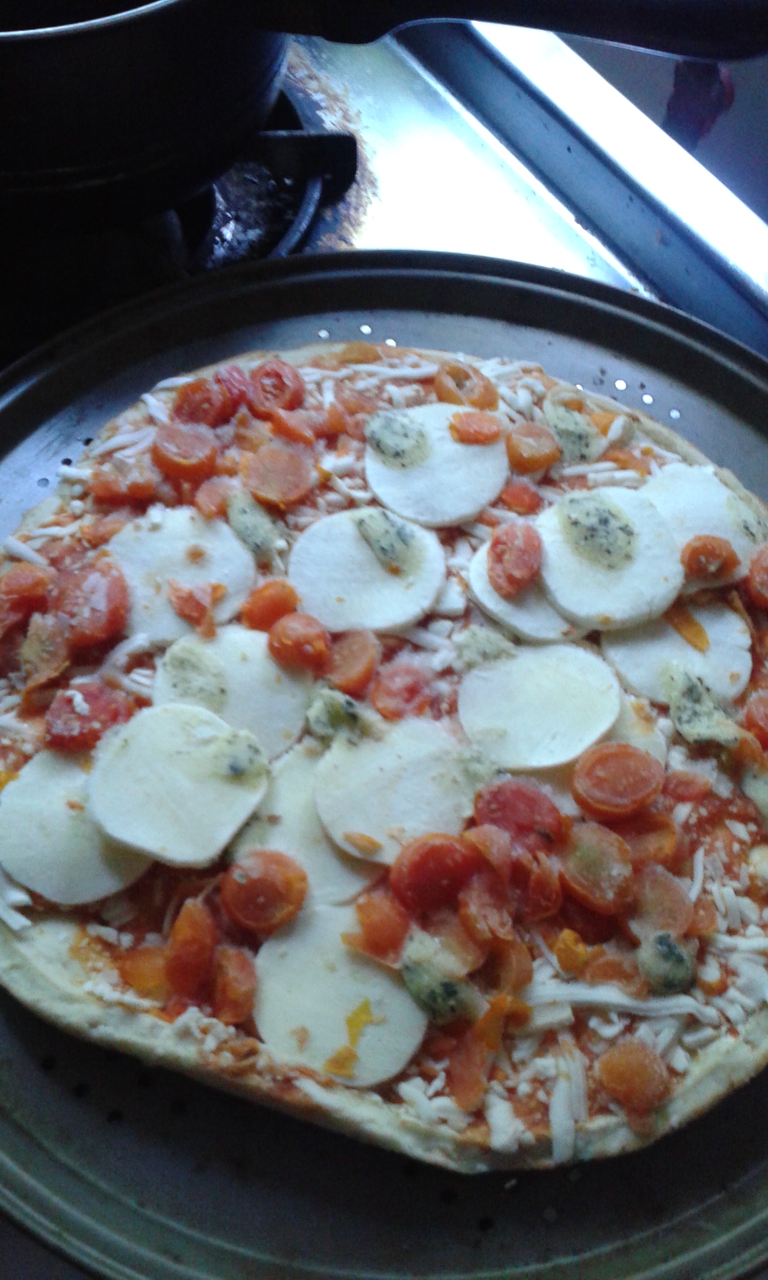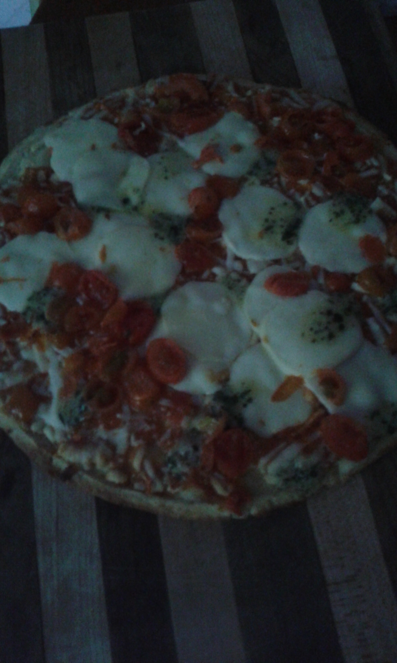 The thin crust was crunchy and starting to burn a bit in my oven so I did not melt the mozzarella slices as much as I could have.