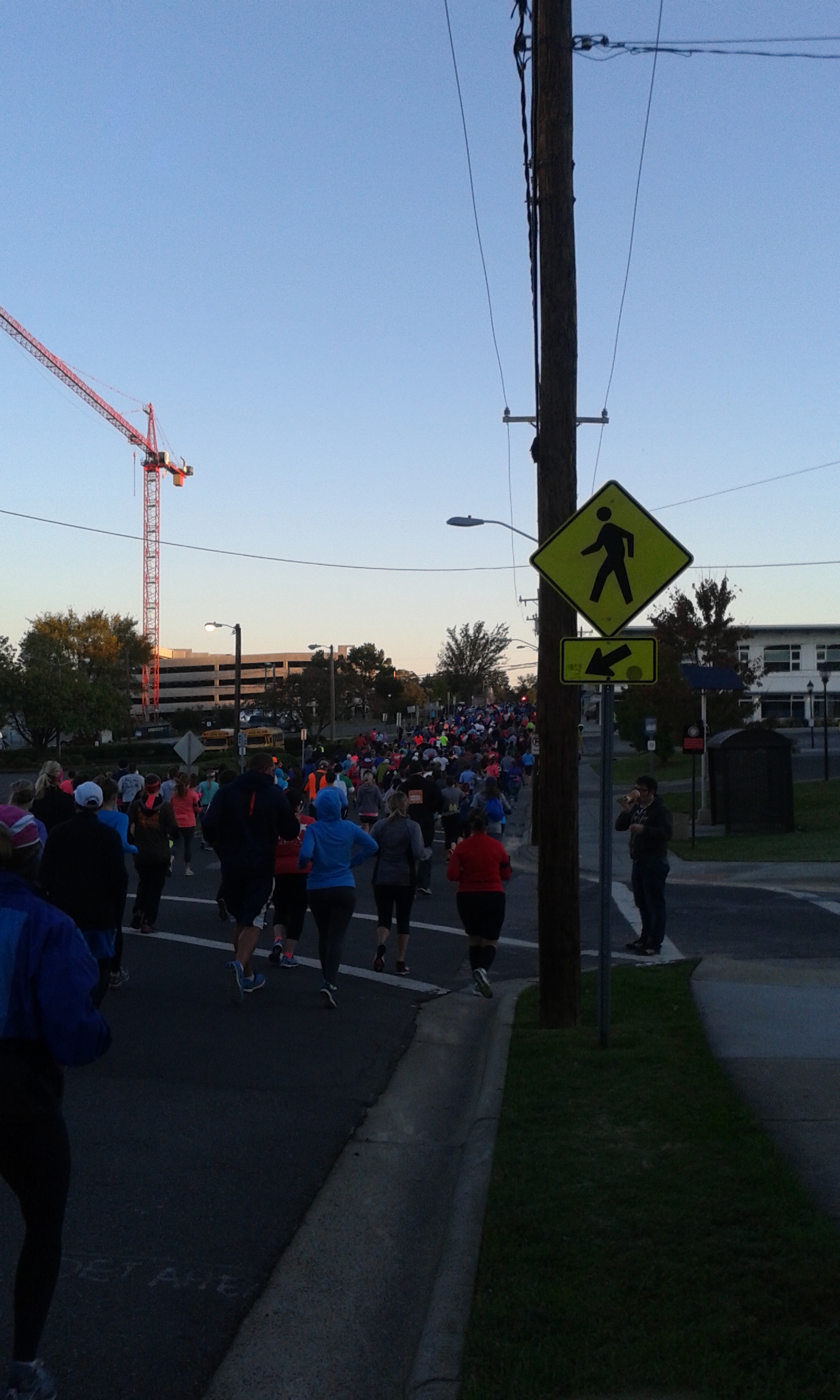 We’ll start the day with it was cold by North Carolina standards when the sun started rising on race day. Julie, who happened to follow my daughter and I out of the parking garage, and I found a building we could go in to keep warm. I was diligently looking for my friend Paul who lives in the Triangle, as he puts it. A guy who looks sort of like Paul – just an FYI, I do not wear my prescription glasses to run – came walking past us and I said “Hey, Paul!” He stopped, gave me a hug and preceded to hold a conversation with me. Yup! You guessed it. He was the wrong Paul. Never met this guy before.