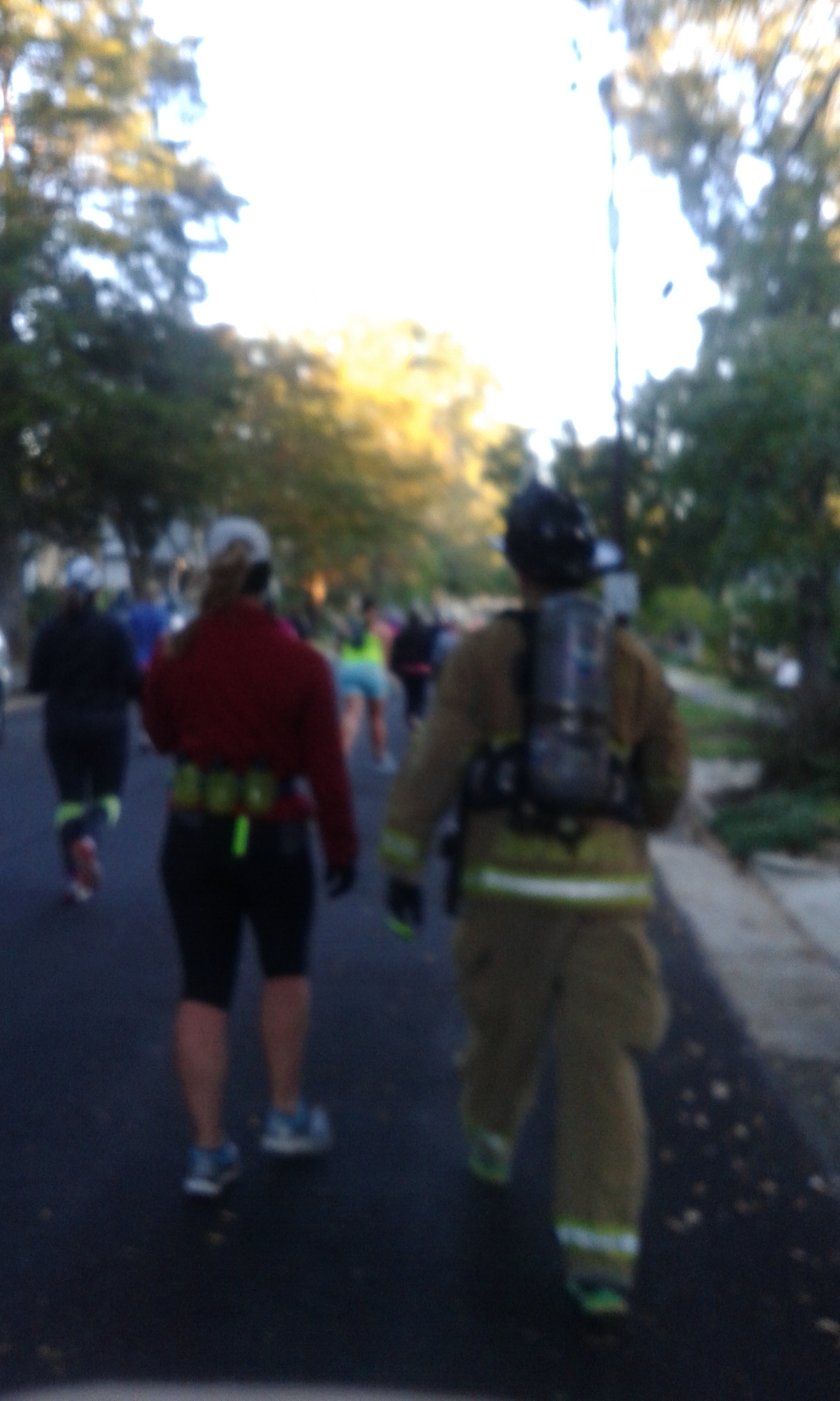 I got through the first five miles in just about an hour. I ran a bit of this leap frogging a fire fighter and his running partner. He was running in turnout gear. They finished about 12 minutes ahead of me – I’m presuming they finished together.