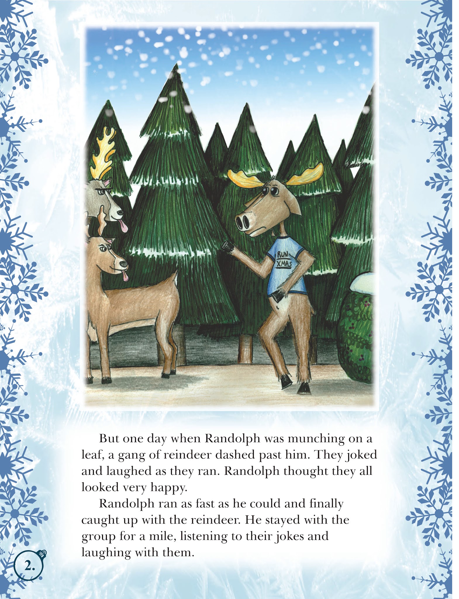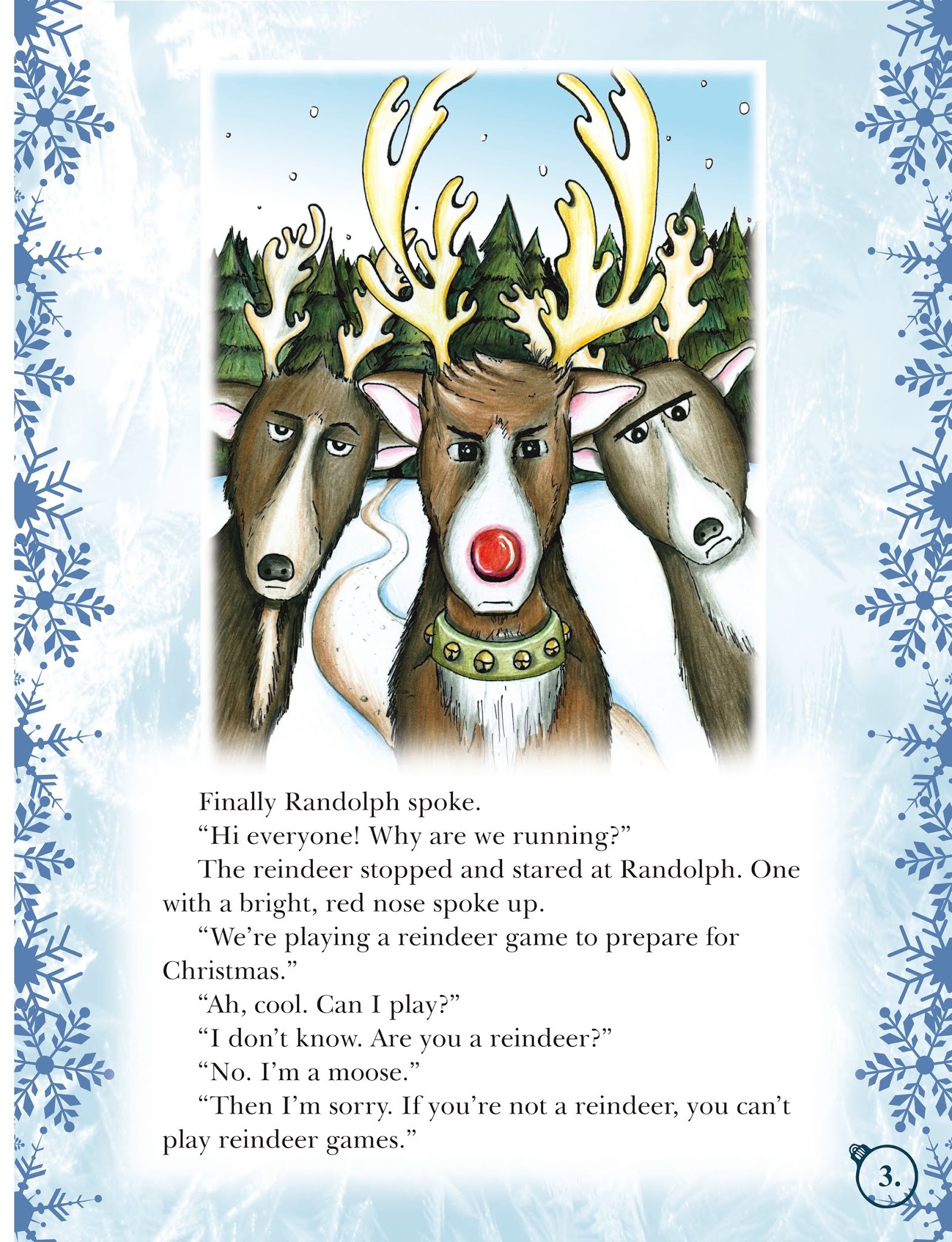 First off, the book starts off with a part of the Christmas fable that children love – reindeer. Unfortunately, they are not behaving any better towards Randolph than they did towards Rudolph in that Christmas classic. The big difference here is Rudolph may be leading the bad attitude.